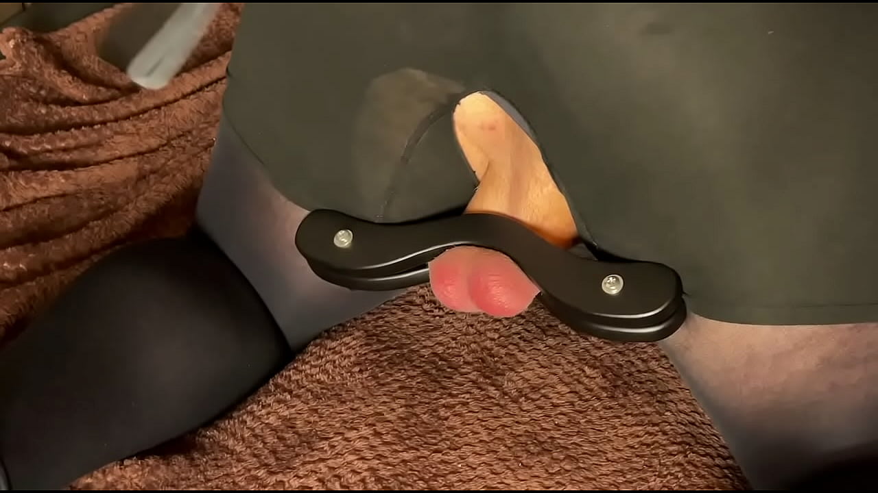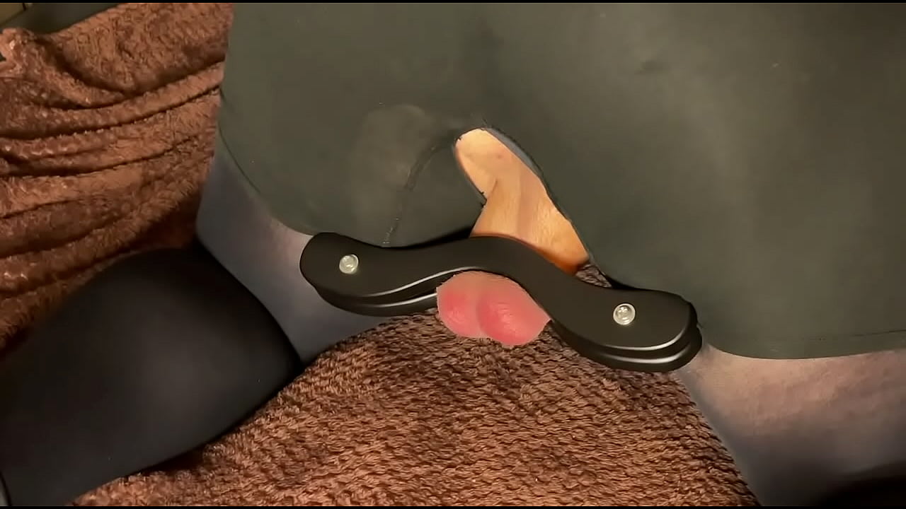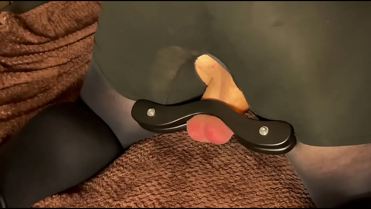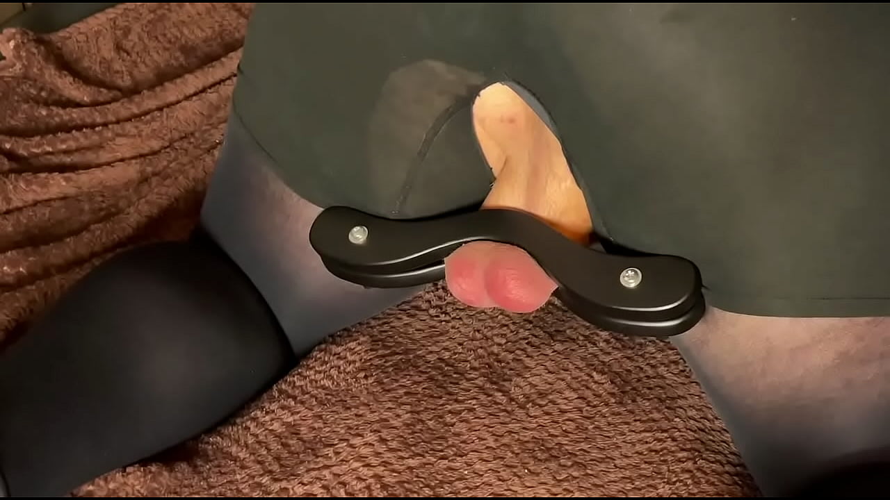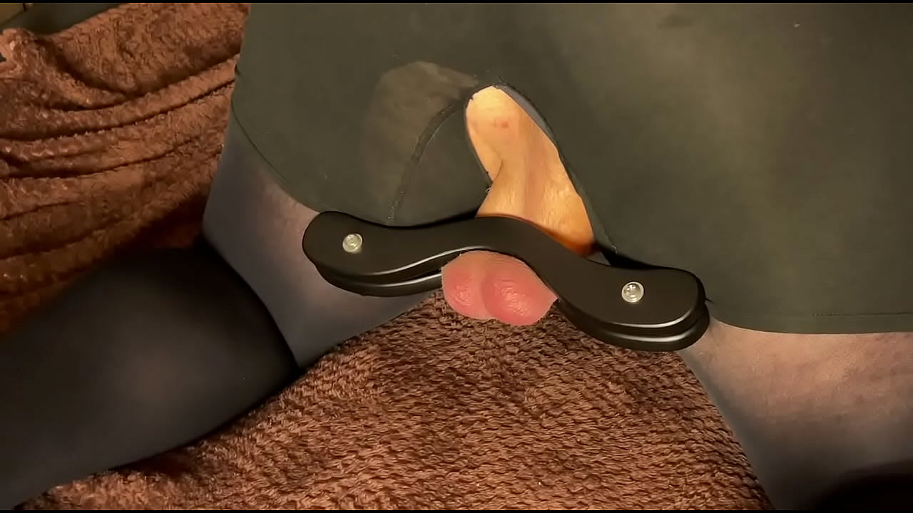 Ballbusting mistress spanks the balls of a fat slave clamped in a humbler